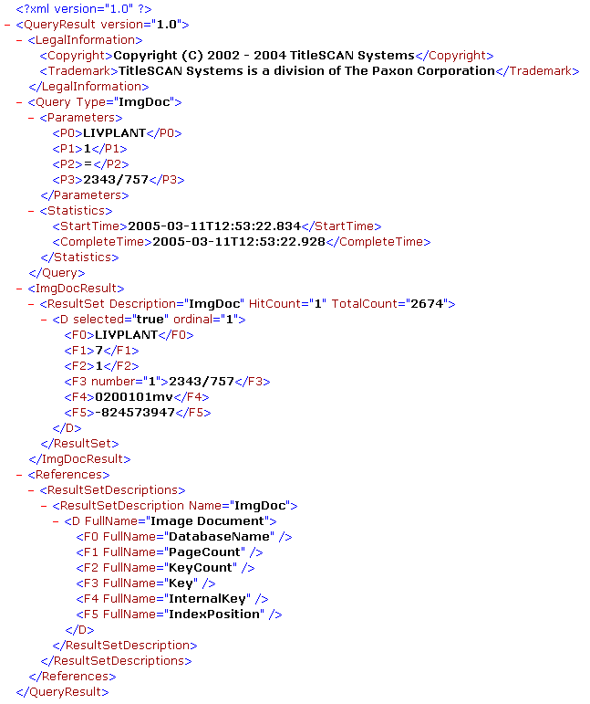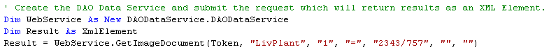 The following samples illustrate how to directly retrieve image document information for an image document independent of any plant document. Referring back to our list of functions in the section titled Primary DAO Functions, the web service call is 'GetImageDocument' and that is shown in the first example below. In the second example, the DAO Page request has 'QueryName=ImageDocument' immediately following the question mark in the query statement.