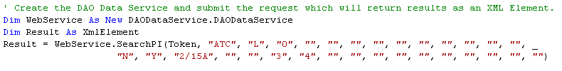 The following samples illustrate how to search for all property index documents posted to lots 3 and 4 of subdivision 2/15A. Referring back to our list of functions in the section titled Primary DAO Functions, the web service call is 'SearchPI' and that is shown in the first example below. In the second example, the DAO Page request has 'QueryName=PISearch' immediately following the question mark in the query statement.